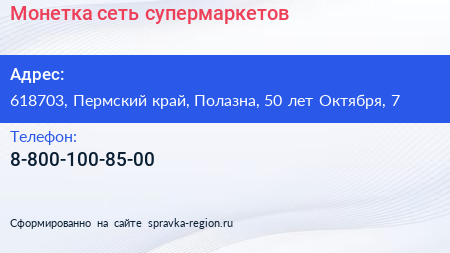 Монетка, сеть супермаркетов по адресу 618703, Пермский край, Полазна, 50 лет Октября, 7 в дальнейшем Организация, размещена в следующих категориях: