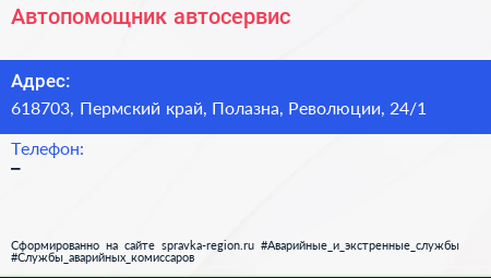 Автопомощник, автосервис по адресу 618703, Пермский край, Полазна, Революции, 24/1 в дальнейшем Организация, размещена в следующих категориях: