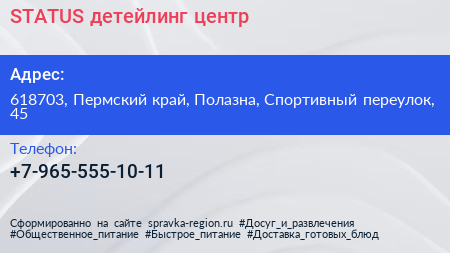 STATUS, детейлинг-центр по адресу 618703, Пермский край, Полазна, Спортивный переулок, 45 в дальнейшем Организация, размещена в следующих категориях: