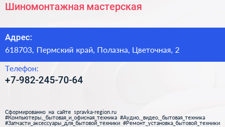 Шиномонтажная мастерская по адресу 618703, Пермский край, Полазна, Цветочная, 2 в дальнейшем Организация, размещена в следующих категориях: