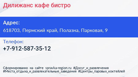Дилижанс, кафе-бистро по адресу 618703, Пермский край, Полазна, Парковая, 9 в дальнейшем Организация, размещена в следующих категориях: