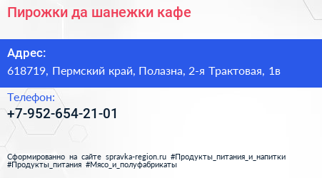 Пирожки да шанежки, кафе по адресу 618719, Пермский край, Полазна, 2-я Трактовая, 1в в дальнейшем Организация, размещена в следующих категориях: