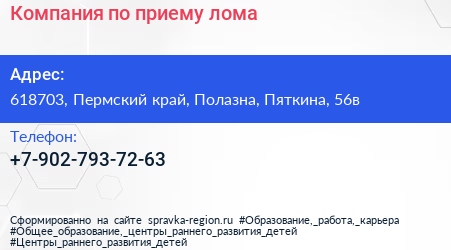 Компания по приему лома по адресу 618703, Пермский край, Полазна, Пяткина, 56в в дальнейшем Организация, размещена в следующих категориях: