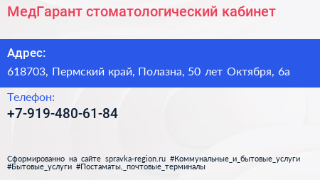 МедГарант, стоматологический кабинет по адресу 618703, Пермский край, Полазна, 50 лет Октября, 6а в дальнейшем Организация, размещена в следующих категориях:
