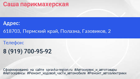 Саша, парикмахерская по адресу 618703, Пермский край, Полазна, Газовиков, 2 в дальнейшем Организация, размещена в следующих категориях:
