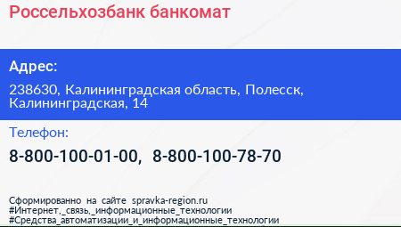 Россельхозбанк, банкомат по адресу 238630, Калининградская область, Полесск, Калининградская, 14 в дальнейшем Организация, размещена в следующих категориях: