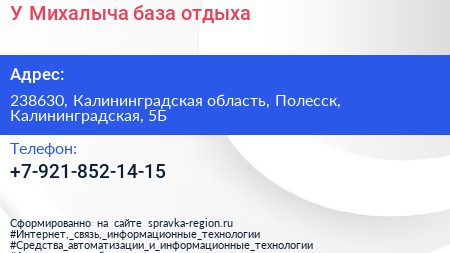 У Михалыча, база отдыха по адресу 238630, Калининградская область, Полесск, Калининградская, 5Б в дальнейшем Организация, размещена в следующих категориях: