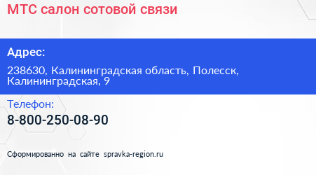 МТС, салон сотовой связи по адресу 238630, Калининградская область, Полесск, Калининградская, 9 в дальнейшем Организация, размещена в следующих категориях: