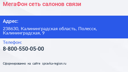 МегаФон, сеть салонов связи по адресу 238630, Калининградская область, Полесск, Калининградская, 9 в дальнейшем Организация, размещена в следующих категориях: