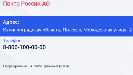 Почта России, АО по адресу Калининградская область, Полесск, Молодежная улица, 2 в дальнейшем Организация, размещена в следующих категориях: