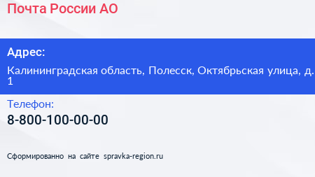 Почта России, АО по адресу Калининградская область, Полесск, Октябрьская улица, д. 1 в дальнейшем Организация, размещена в следующих категориях: