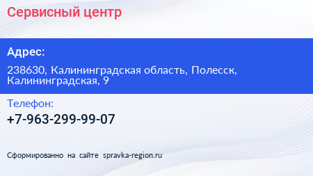 Сервисный центр по адресу 238630, Калининградская область, Полесск, Калининградская, 9 в дальнейшем Организация, размещена в следующих категориях: