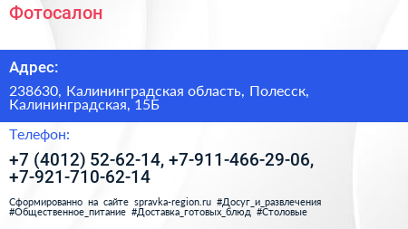 Фотосалон по адресу 238630, Калининградская область, Полесск, Калининградская, 15Б в дальнейшем Организация, размещена в следующих категориях: