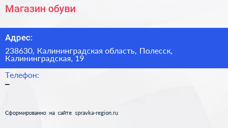 Магазин обуви по адресу 238630, Калининградская область, Полесск, Калининградская, 19 в дальнейшем Организация, размещена в следующих категориях: