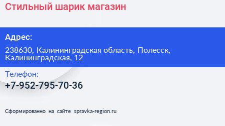 Стильный шарик, магазин по адресу 238630, Калининградская область, Полесск, Калининградская, 12 в дальнейшем Организация, размещена в следующих категориях: