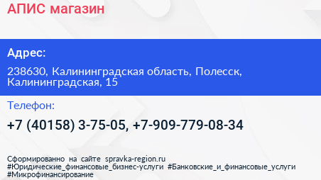 АПИС, магазин по адресу 238630, Калининградская область, Полесск, Калининградская, 15 в дальнейшем Организация, размещена в следующих категориях: