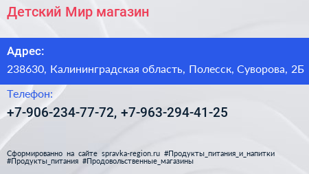 Детский Мир, магазин по адресу 238630, Калининградская область, Полесск, Суворова, 2Б в дальнейшем Организация, размещена в следующих категориях: