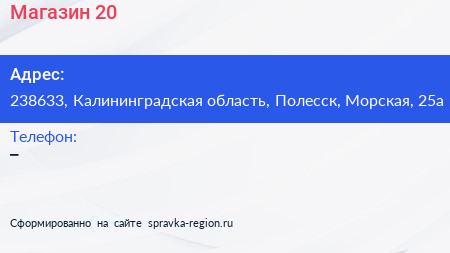 Магазин №20 по адресу 238633, Калининградская область, Полесск, Морская, 25а в дальнейшем Организация, размещена в следующих категориях: