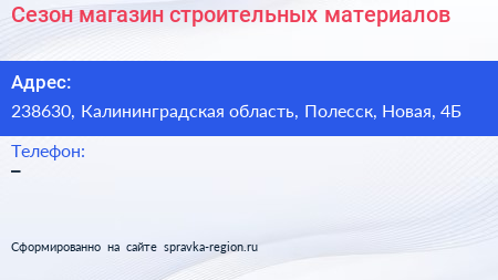 Сезон, магазин строительных материалов по адресу 238630, Калининградская область, Полесск, Новая, 4Б в дальнейшем Организация, размещена в следующих категориях:
