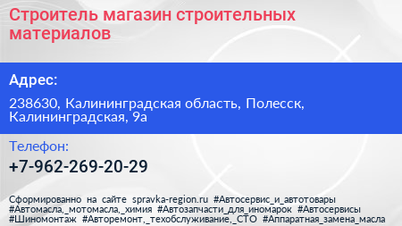 Строитель, магазин строительных материалов по адресу 238630, Калининградская область, Полесск, Калининградская, 9а в дальнейшем Организация, размещена в следующих категориях: