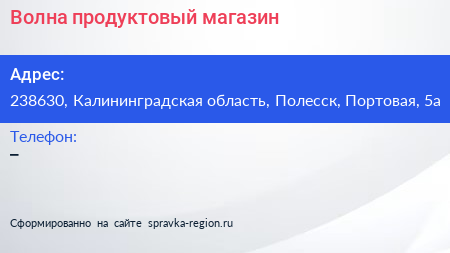 Волна, продуктовый магазин по адресу 238630, Калининградская область, Полесск, Портовая, 5а в дальнейшем Организация, размещена в следующих категориях: