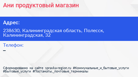 Ани, продуктовый магазин по адресу 238630, Калининградская область, Полесск, Калининградская, 32 в дальнейшем Организация, размещена в следующих категориях: