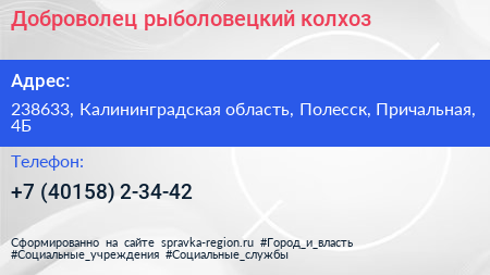 Доброволец, рыболовецкий колхоз по адресу 238633, Калининградская область, Полесск, Причальная, 4Б в дальнейшем Организация, размещена в следующих категориях: