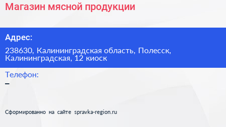 Магазин мясной продукции по адресу 238630, Калининградская область, Полесск, Калининградская, 12 киоск в дальнейшем Организация, размещена в следующих категориях: