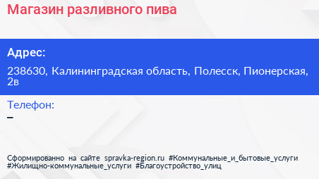Магазин разливного пива по адресу 238630, Калининградская область, Полесск, Пионерская, 2в в дальнейшем Организация, размещена в следующих категориях: