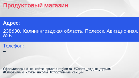 Продуктовый магазин по адресу 238630, Калининградская область, Полесск, Авиационная, 62Б в дальнейшем Организация, размещена в следующих категориях:
