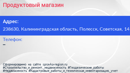 Продуктовый магазин по адресу 238630, Калининградская область, Полесск, Советская, 14 в дальнейшем Организация, размещена в следующих категориях: