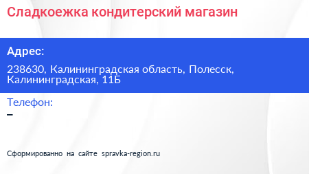 Сладкоежка, кондитерский магазин по адресу 238630, Калининградская область, Полесск, Калининградская, 11Б в дальнейшем Организация, размещена в следующих категориях: