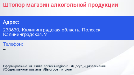 Штопор, магазин алкогольной продукции по адресу 238630, Калининградская область, Полесск, Калининградская, 9 в дальнейшем Организация, размещена в следующих категориях: