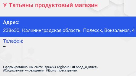 У Татьяны, продуктовый магазин по адресу 238630, Калининградская область, Полесск, Вокзальная, 4 в дальнейшем Организация, размещена в следующих категориях: