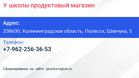 У школы, продуктовый магазин по адресу 238630, Калининградская область, Полесск, Шевчука, 5 в дальнейшем Организация, размещена в следующих категориях:
