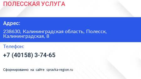 ПОЛЕССКАЯ УСЛУГА по адресу 238630, Калининградская область, Полесск, Калининградская, 8 в дальнейшем Организация, размещена в следующих категориях: