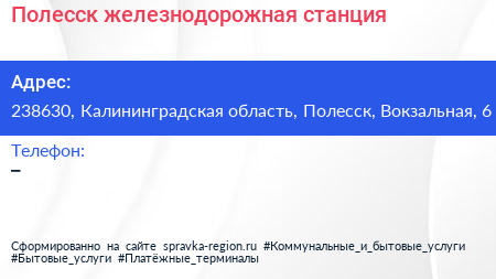 Полесск, железнодорожная станция по адресу 238630, Калининградская область, Полесск, Вокзальная, 6 в дальнейшем Организация, размещена в следующих категориях: