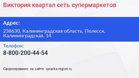 Виктория квартал, сеть супермаркетов по адресу 238630, Калининградская область, Полесск, Калининградская, 14 в дальнейшем Организация, размещена в следующих категориях: