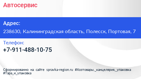 Автосервис по адресу 238630, Калининградская область, Полесск, Портовая, 7 в дальнейшем Организация, размещена в следующих категориях: