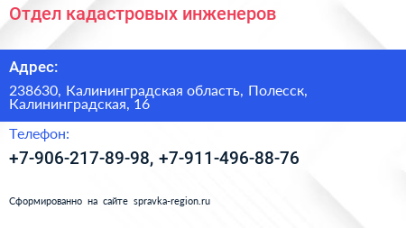Отдел кадастровых инженеров по адресу 238630, Калининградская область, Полесск, Калининградская, 16 в дальнейшем Организация, размещена в следующих категориях: