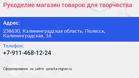 Рукоделие, магазин товаров для творчества по адресу 238630, Калининградская область, Полесск, Калининградская, 16 в дальнейшем Организация, размещена в следующих категориях: