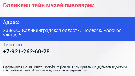 Бланкенштайн, музей пивоварни по адресу 238630, Калининградская область, Полесск, Рабочая улица, 5 в дальнейшем Организация, размещена в следующих категориях: