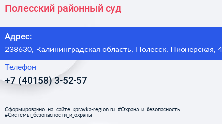 Полесский районный суд по адресу 238630, Калининградская область, Полесск, Пионерская, 4 в дальнейшем Организация, размещена в следующих категориях: