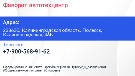 Фаворит, автотехцентр по адресу 238630, Калининградская область, Полесск, Калининградская, 46Б в дальнейшем Организация, размещена в следующих категориях: