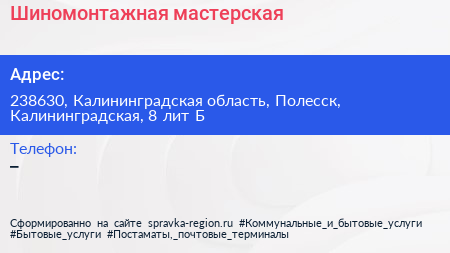 Шиномонтажная мастерская по адресу 238630, Калининградская область, Полесск, Калининградская, 8 лит Б в дальнейшем Организация, размещена в следующих категориях: