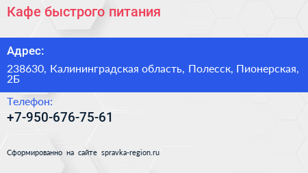 Кафе быстрого питания по адресу 238630, Калининградская область, Полесск, Пионерская, 2Б в дальнейшем Организация, размещена в следующих категориях: