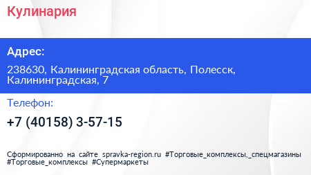 Кулинария по адресу 238630, Калининградская область, Полесск, Калининградская, 7 в дальнейшем Организация, размещена в следующих категориях: