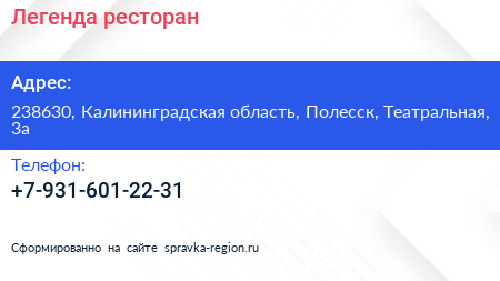Легенда, ресторан по адресу 238630, Калининградская область, Полесск, Театральная, 3а в дальнейшем Организация, размещена в следующих категориях:
