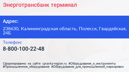 Энерготрансбанк, терминал по адресу 238630, Калининградская область, Полесск, Гвардейская, 24Б в дальнейшем Организация, размещена в следующих категориях: