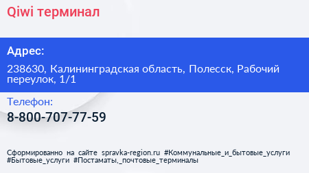 Qiwi, терминал по адресу 238630, Калининградская область, Полесск, Рабочий переулок, 1/1 в дальнейшем Организация, размещена в следующих категориях: